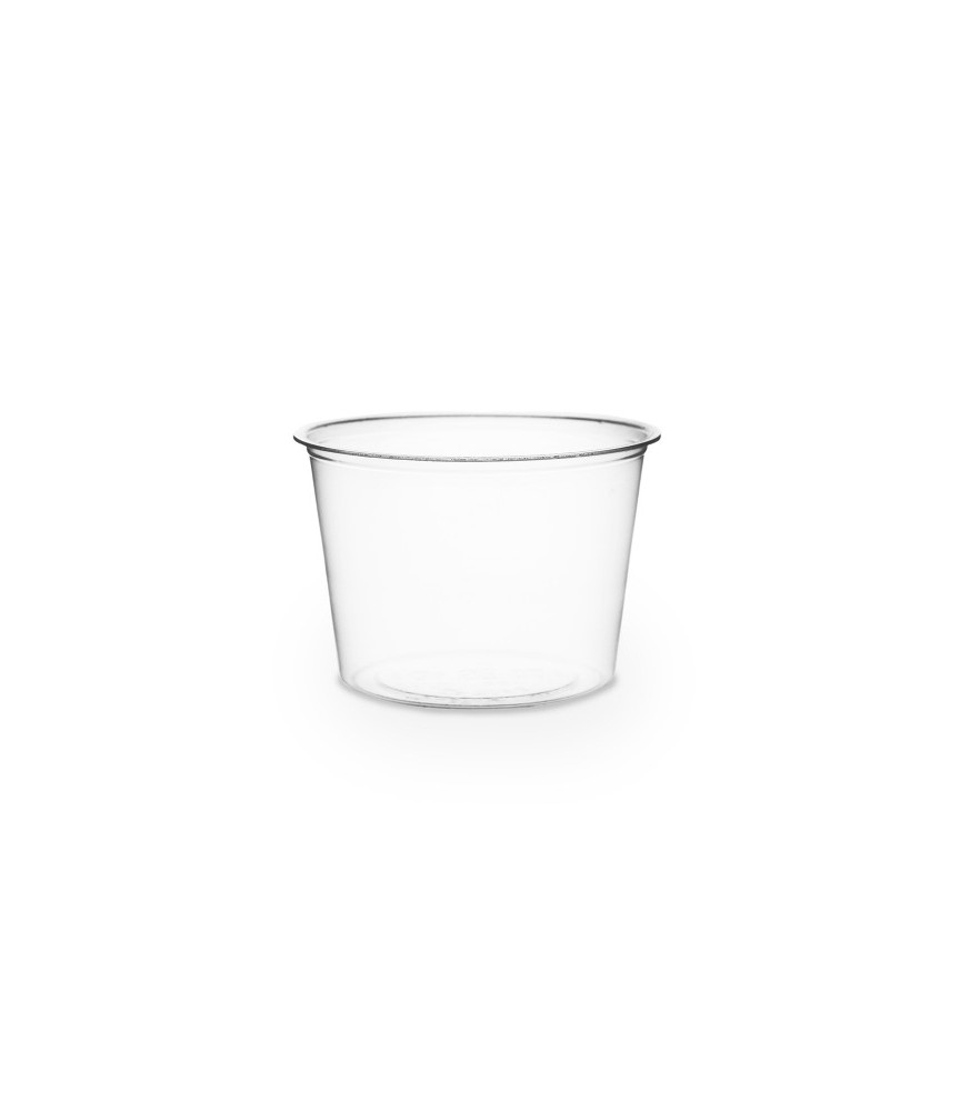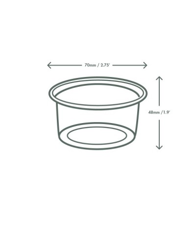 Olla redonda ecológica. Una tapa plana se adapta a todos los tamaños, para un excelente sellado y fácil apilamiento. Para aderezos fríos o salsas, mini botanas o botes de proteínas, o degustaciones. Fabricado con PLA, un material renovable elaborado a partir de plantas. Despejado para visibilidad.